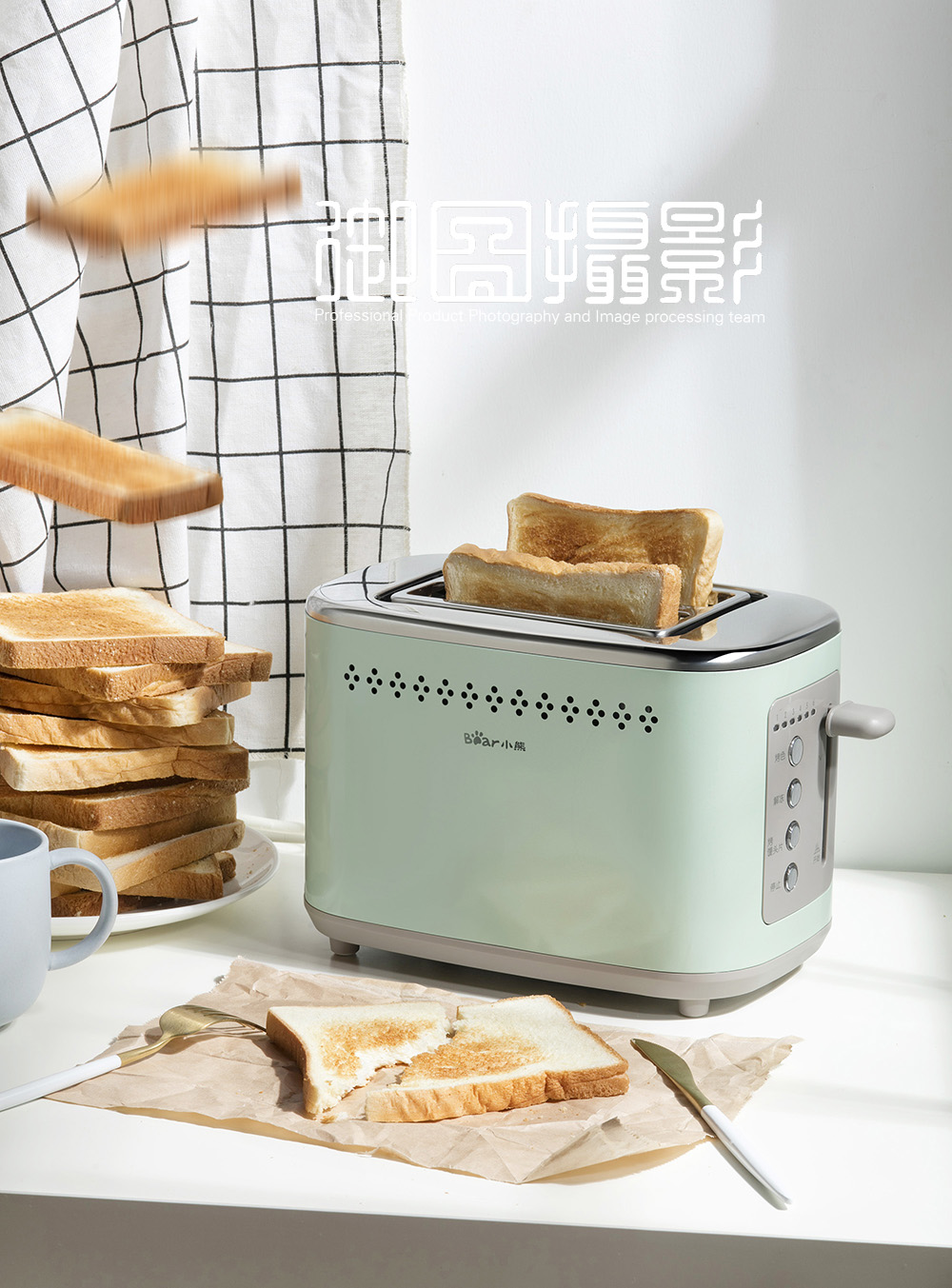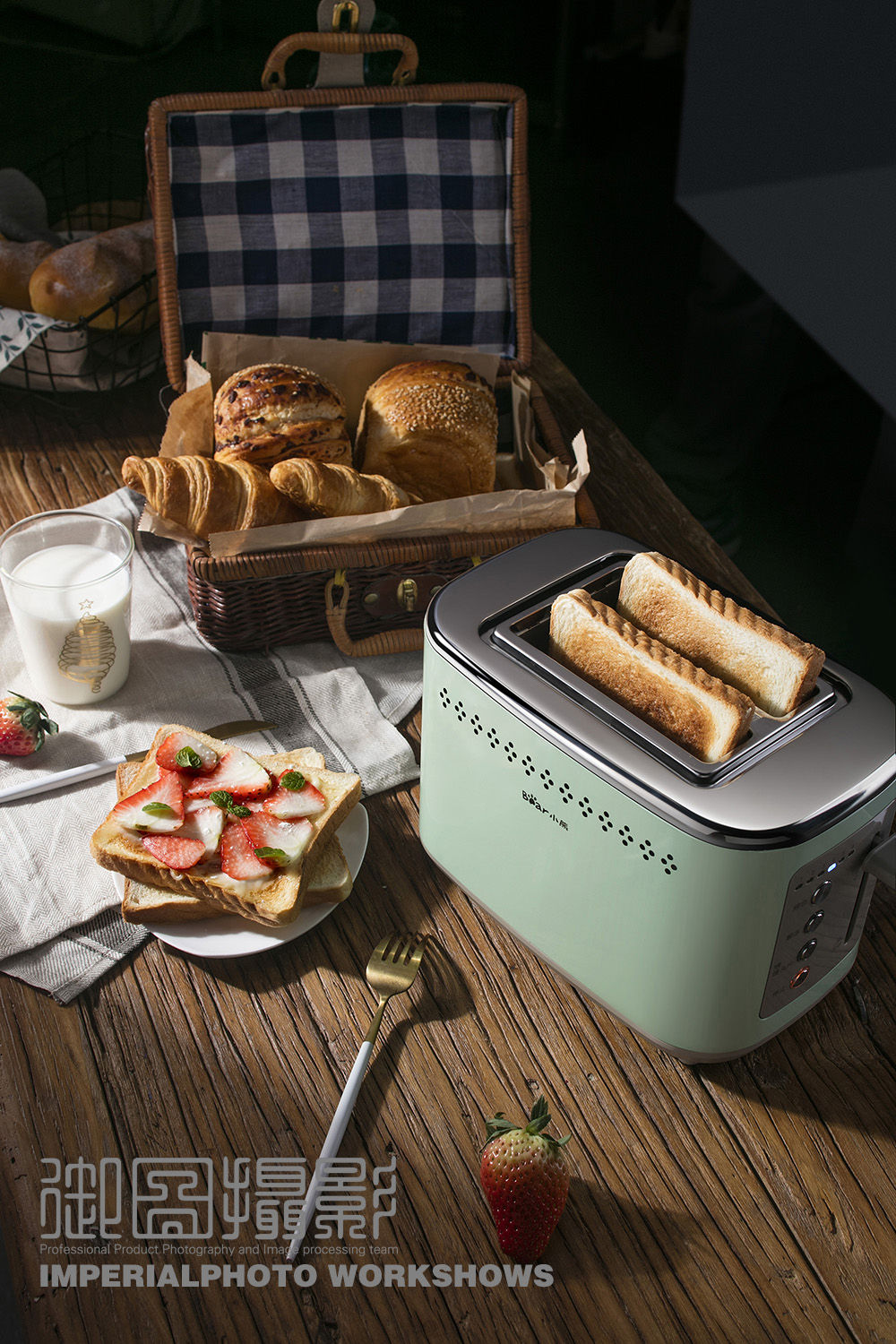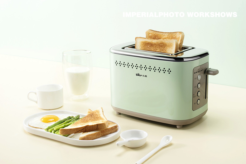 拍摄场景图的时候用最多的是左右光,强调产品的明暗的对比,或者是前后光,让产品的表现更融进实景中去。尤其是拍摄带有食物的小家电图,后面打光过来食物会更有光感,挑起人的食欲。