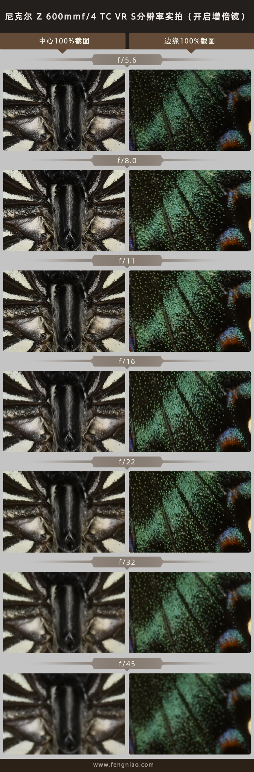 在分辨率测试环节中,我们来看看尼克尔 Z 600mm f/4 TC VR S的分辨率表现,我采用的机身是尼康Z 9、三脚架固定、关闭机身防抖、固定ISO 100、逐级调整光圈,RAW+JPEG双格式记录,分别对拍摄画面的中心和边缘位置进行100%截图观察,首先来看看没有开启1.4倍增倍镜的分辨率表现。