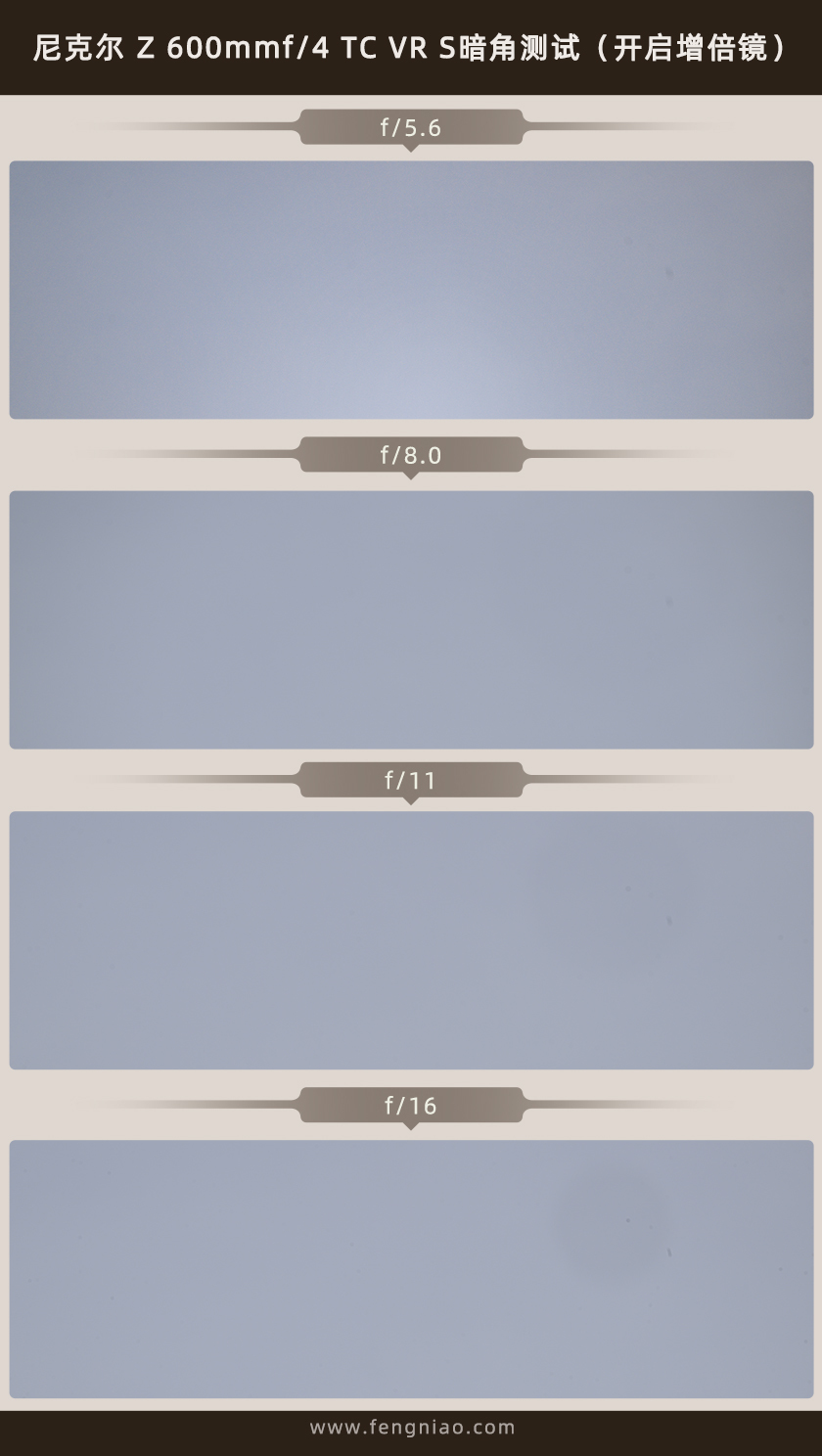 由于这支尼克尔 Z 600mm f/4 TC VR S是自带1.4倍增倍镜的,所以在暗角测试方面,我分别开启以及关闭增倍镜来进行拍摄,通过实际拍摄可以发现,在未开启增倍镜的情况下,这支镜头存在非常轻微的暗角现象,而在开启增倍镜之后,最大光圈变成了f/5.6,实际拍摄可以发现其同样也存在非常轻微的暗角现象,这样的表现对于拍摄的时候无伤大雅,实际对画质并没有什么影响。